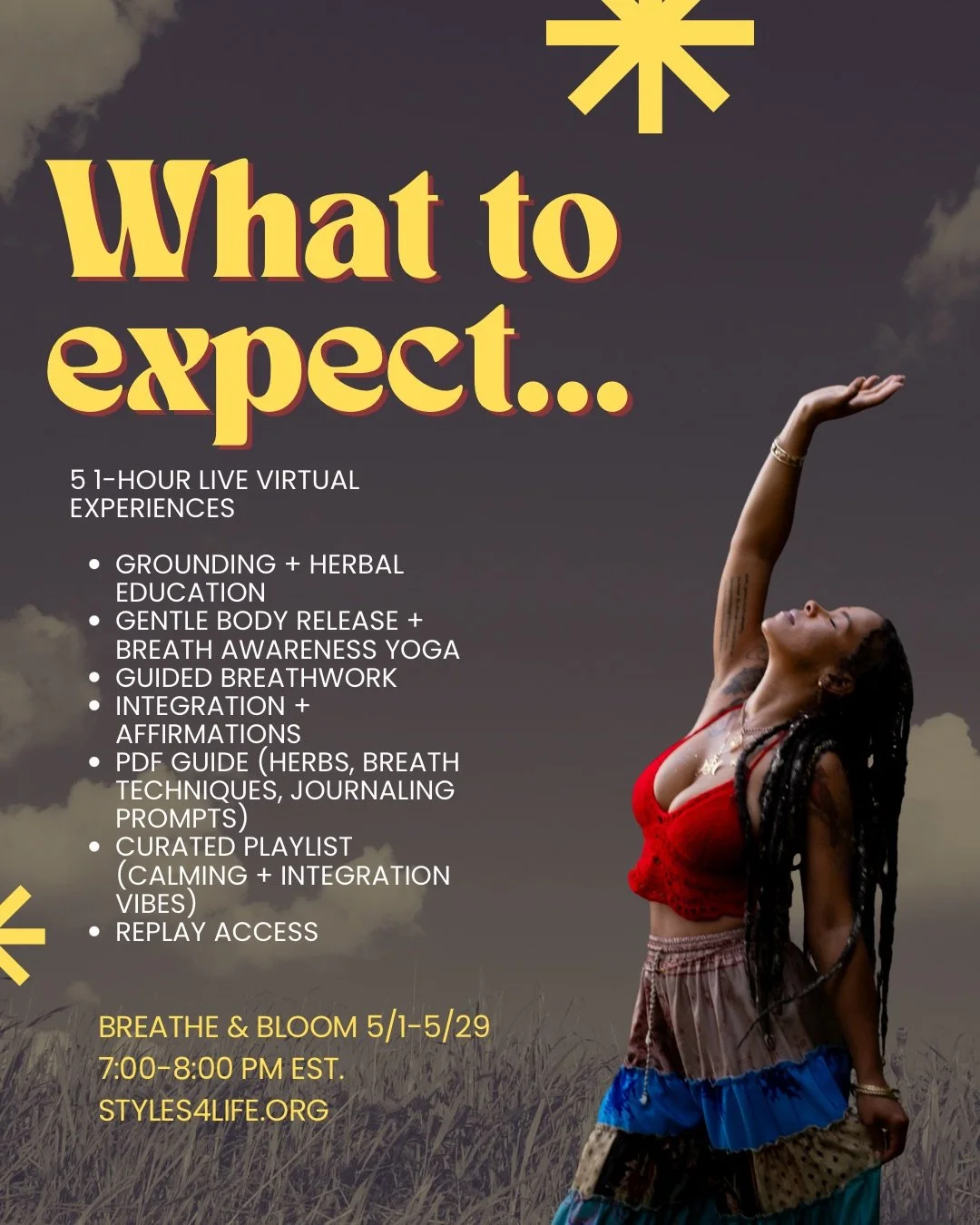 A weekly 60-minute virtual experience designed to help you release stress, calm your nervous system, and reconnect with mind, body & spirit.